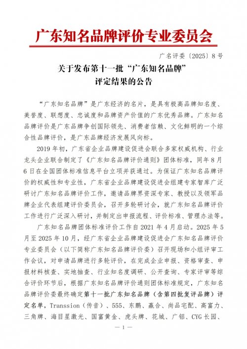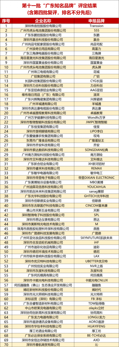 广东知名品牌团体标准评价工作自2021年4月启动。2025年5月至2025年10月,经广东省企业品牌建设促进会广东知名品牌评价专业委员会(以下简称广东知名品牌评价委)召开现场和小组评审工作会议,对申请品牌进行多轮评价,在完成企业申报、资格审查、申报材料核查、实地抽查、行业知名度调研、公开查询、专家评审等综合评价环节后,根据广东知名品牌评价通则团体标准规定,广东知名品牌评价委最终确定第十一批广东知名品牌(含第四批复评品牌)评定名单,Transsion(传音)、555、东鹏、赢合、尚品宅配、高富力、三角牌、海目星激光、国富黄金、虎头牌、花城、广铝、CYG长园、力合科创、AAG亚铝、滋采、兴辉瓷砖、羊城通、奔达康、卓越教育、Wondfo万孚、JWIPC智微智能、佳宝、LIPO李白、叹鸡、广隆蛋挞王、乔安、SONGDIAN松典、南方测绘、艾科维达、XH新河铝材、REMAX、敏华电工、帝显DIXIAN ELECTRONIC、MBO美博、YOUCAIHUA、sanag塞那、GHTECH光华科技、倍联德、CINCOM喜来康、天斯、SPL(智微电子)、思达、M(美特斯光电)、鼎胜、广晟德、SKYNFUTURE肌肤未来、iHF(合发齿轮)、迪彩、德尼、LAX(锐丰)、UBETTER优贝特、NVR上扬、灰度科技、何氏模具、卡能光电Cnlux、蹦蹦鱼、烯时代、光大特照、FB沣标、TDW贴得稳、olayks立时、协同高科、LONGLI龙力、AORO遨游、HUAYIFENG、厚工坊、BE-TCHE必达、AXD(安信达)、沁等共70个申报品牌获评“广东知名品牌”。根据广东知名品牌评价工作要求,现对获评品牌进行公示。