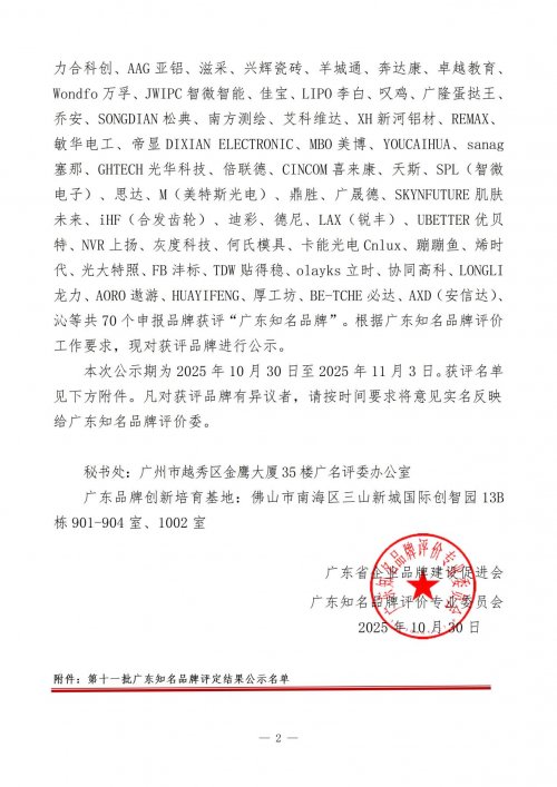 本次公示期为2025年10月30日至2025年11月3日。获评名单见下方附件。凡对获评品牌有异议者,请按时间要求将意见实名反映给广东知名品牌评价委。